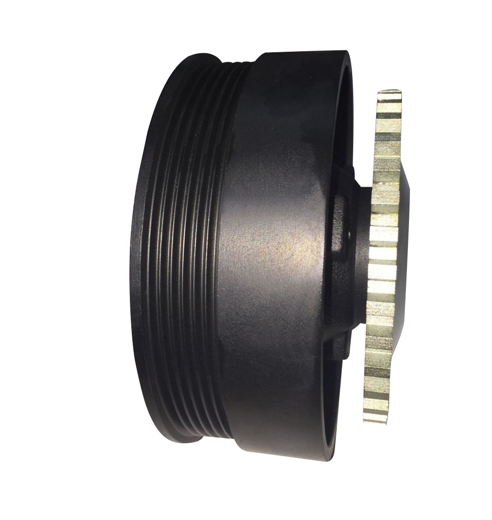 曲軸減震皮帶輪,是發動機前端附件系統的重要零件之一,分為橡膠減震皮帶輪、硅油扭轉減震皮帶輪及橡膠硅油復合型扭轉減震皮帶輪,基本結構一般由輪轂、外圈、橡膠組成,大多安裝于曲軸的前端,傳遞曲軸輸出的扭矩以驅動輪系附件。